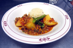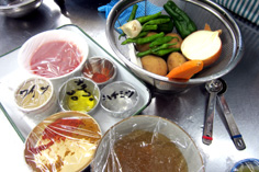 材料 4人分 牛挽肉・豚挽肉 各150g 白ワイン 50cc オリーブオイル 10cc ※野菜 ニン二ク 5g タマネギ 150g ニンジン 50g ピーマン 2個 ダイスカットトマト(缶詰) 100g オリーブオイル 20cc ※香辛料 パプリカパウダー 3g クミン 1g ピマンデスペレット(バスク地方の甘唐辛子。韓国の甘唐辛子でも) 1g カレー粉 1g ハチミツ 5g フォンブラン(鶏がらスープ。固形のものでも) 300cc ※付け合せ しし唐 8本 ジャガイモ 中2個 バターライス(米 1合 フォンブラン 195cc 無塩バター 6g 塩 一つまみ |