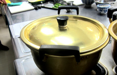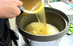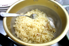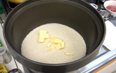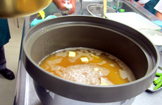 出来上がったバターライス。最後の盛り付けまで炊飯器に入れたまま。プリン型などの型を用意 |