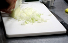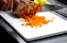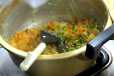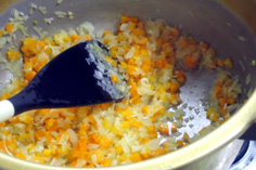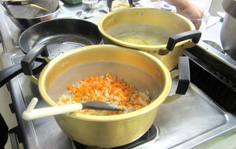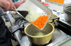 タマネギ、ニンジン、塩一つまみを入れ、 |