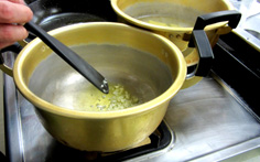 オリーブオイルにニン二クと塩一つまみを入れ火を付け、香りを引き出す |