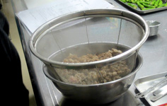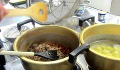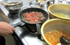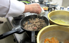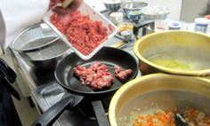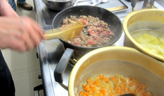 フライパンにオリーブオイルを10cc入れ、2種類の挽肉を炒める。塩一つまみを加える。 |