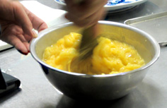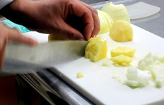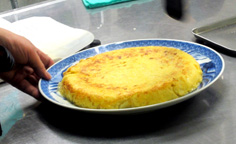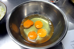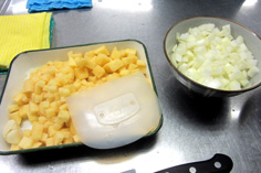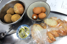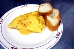材料 4人分 卵 4個 ジャガイモ 中3個(600g) タマネギ 大1/2個(200g) ニン二ク 1片 オリーブオイル 80cc バケット 1本 |