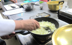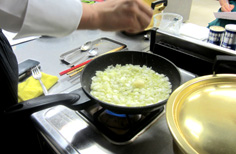 フライパンにオリーブオイル80ccとニン二クを入れ |