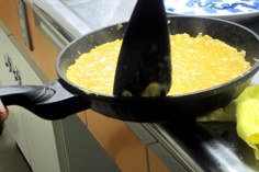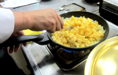 大きめの皿を被せ、フライパンを一気に返す。綺麗に焼けた。 |