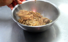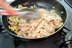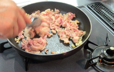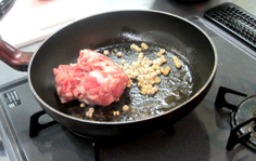 フライパンにゴマ油を引き、豚小間肉とハト麦を入れ |