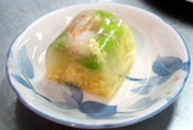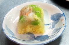 とよ型に枝豆と、1cm位に切った茹でエビを敷いておく。200ccの水に粉寒天を振りいれ、だしの素と一緒に溶かしておく、 |