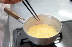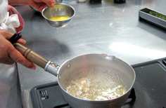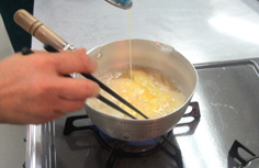 鍋に溶かしておいた寒天を入れ、火にかける |