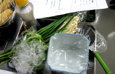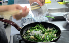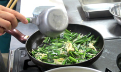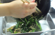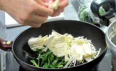 ニラ 1束(150g程度) エノキ 1/2パック シラス 大さじ2 ゴマ油 大さじ1 ショウユ 小さじ2 コンブ出汁 1/4カップニラは3cmに切る エノキは根元を落とし、半分に切る フライパンにゴマ油とニラ、エノキはほぐしながら入れる 火にかけ、炒める しんなりしたら、シラスを加え 出汁を入れる 混ぜながら火を通し、汁気が残る位でおろす バットに広げて粗熱を取る 他の料理に、添えて盛り付ける。完成! 前のページへ 次のページへ
