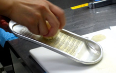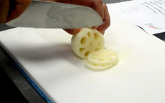 レンコンは皮をむき、3mm程度の輪切りを5枚取る |