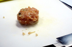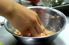 ボールに挽肉、レンコンのすりおろし、ネギ、片栗粉を入れ |