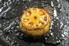 フライパンに油を引き、レンコンを下にして置き、中火で焼く |