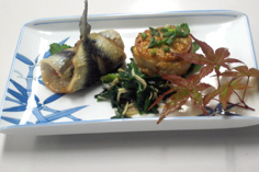 鰯とニラのお浸し、つくねの三種盛りが完成! |