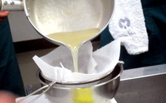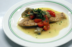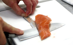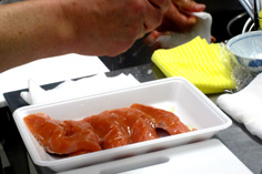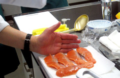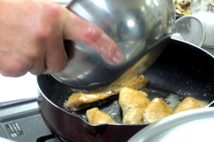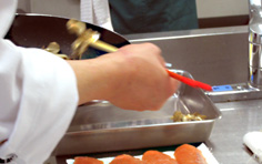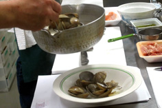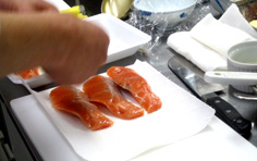 ※アサリの火入れ用 アサリ 400g ニン二ク 1片 オリーブオイル 10cc 水 70cc ※舞茸入りアサリのバターソース用 無塩バター 35g アサリの漉した煮汁 約160cc オリーブオイル 15cc 塩・コショウ 適宜 鮭は皮を引く レモン汁とオリーブオイルで、10分ほどマリネする ニン二クを潰す 鍋にオリーブオイルとニン二クを入れて火をつけ 香りが出たらアサリを一気にいれ水を加える フタをして強火にし、少し揺すりながら1分半ほど火にかけ口を開ける。 口が開いたものから取り出し 身を殻からはずす 煮汁はキッチンペーパー等で漉す トマトは縦に6等分に切る。舞茸はほぐす 鮭の水気を取る キッチンペーパーではさみ、軽く押さえて水気を取る 軽く塩・コショウ フライパンにオリーブオイルとバターを入れて 舞茸を炒める。軽く塩・コショウ 取り出す 舞茸を炒めたフライパンは洗わないで、キッチンペーパーで軽く油を拭く 鮭に小麦粉をまぶす 舞茸を炒めたフライパンにオリーブオイルとバターを入れ、鮭を焼く。このとき、盛り付けの表になる面をしたにして焼く うっすら色が付いたら返す 全体で1分半ほど焼いたら、余分な油を取り アサリの汁を半分ほど入れ 火からはずして蒸らす。1分ほどしたら、返す