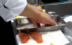 秋鮭 5切れ 舞茸 約110g パセリのみじん切り 適宜 ミニトマト 10個 ※鮭のマリネ用 オリーブオイル 30cc レモン汁 5cc ※鮭のムニエル用 無塩バター 30g オリーブオイル 20cc 小麦粉 適宜 塩・コショウ 適宜