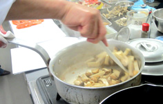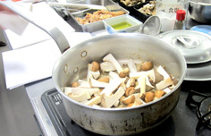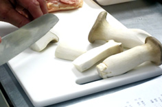 マッシュルームはペーパーで汚れを拭き取り、半分に切る |