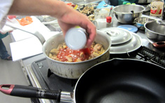 トマト缶の1/3位に水を入れて、中身を洗いながら加える |
