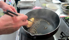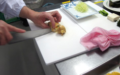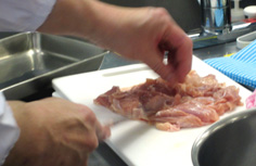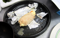インゲン、ニンジン、チーズを7cm×1cmに切る。それぞれ6本作る。野菜は茹でる 鶏もも肉は、スジや軟骨を取り除き、厚みを平均になるように開く 横に3枚に切る 下味用のタレの半分をかけて、5分ほどおく。5分経ったら取り出しておく。長くおくと味が濃すぎる。オーブンを温め、140度に設定しておく 鶏肉にインゲン・ニンジン・チーズをのせ、巻いてゆく この様に 次に、アルミホイルでしっかり巻く。140度のオーブンで10分焼く オーブンから取り出し、アルミホイルを取る 残っている、下味用のタレに砂糖を足し フライパンで熱し 鶏肉を転がしながらタレをからませる。照りが出たら 輪切りにする 千切りキャベツを添えて、完成! 前のページへ 次のページへ