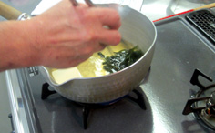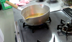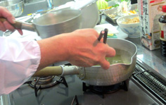鍋に出し汁360ccを入れ、薄口醤油 15cc、酒 10cc 塩 少々で吸い地を作る |
