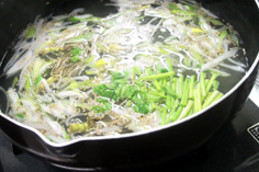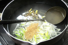 ガラスープを作り、ネギ、セリ、白ゴマを入れ