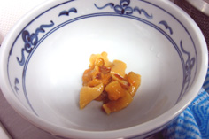 材料 4人分 ホヤ 1個 溶き玉子 1個 大葉 2枚 出し汁 適量 水溶き片栗粉 適量 ※吸い汁 薄口醤油 適量 ミリン 適量 塩 適量 ホヤをむき、中の黒いところを取り除く。短冊に切る |