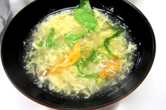 鍋に出汁を引き、沸かし、吸い汁の調味料を合わせ、水溶き片栗粉で薄いアンに仕立てる。溶き玉子を溶きいれる。ホヤと大葉を入れた器の上から注ぐ。完成! |