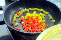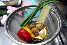 牛肉(今回は豚肉) 200g ニン二クの芽 40g 赤・黄パプリカ 各40g 生シイタケ 40g ニン二ク 1片 唐辛子輪切り 少々 市販のおこげ 2枚