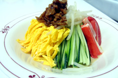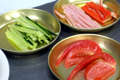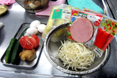 材料 4人分 キュウリ 120g ハム 60g カニカマボコ 80g トマト 1/2個 モヤシ(芽と根を取っておく) 120g 卵 2個 ネギ・ショウガ 各10g ゴマ油用意 |