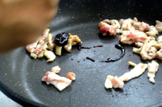 炒めて、トウバンジャンとショウユで味付けする |