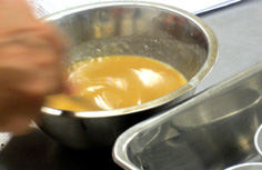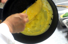 溶き卵に塩少々と水溶き片栗粉少々を加えて、薄焼き卵を作る |