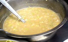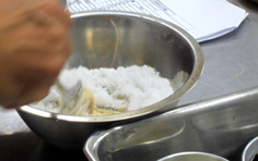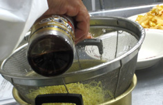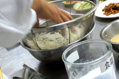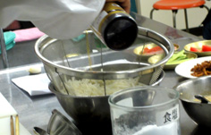 次に酢を少しずつ入れて馴染ませ、ショウユ、水を加える。 |