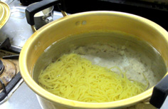 麺を茹でる。業務用の冷凍麺は、すでに茹でてあるものなので、熱湯で1分ほどで上げる。他の麺を使用する得は説明に従う |