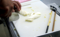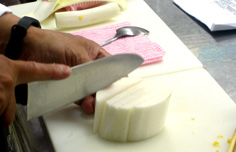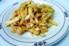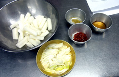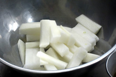 材料 4人分 大根 160g 長ネギ 30g ※合わせ調味料(粉山椒 少々 トウバンジャン 小さじ2 塩 少々 ゴマ油 大さじ1) |