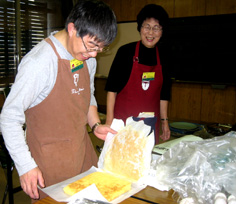 | 厚焼き玉子みたいね | 同じ大きさに切って | この日のための手作り杵。器用! |