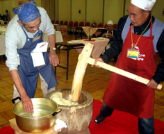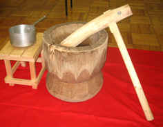 | 杵の作り手が、まずヨイショ! | 舞台はこんなもん? | 今年は渋くて良い木を用意 |
