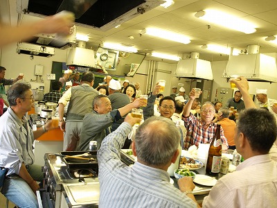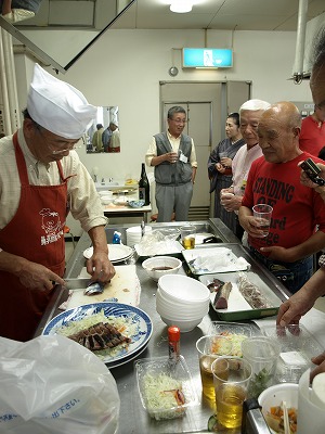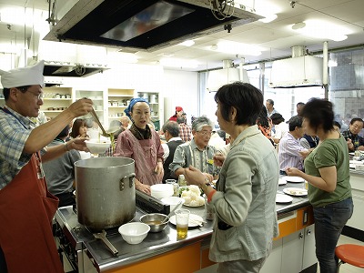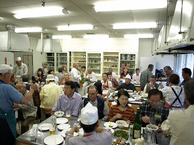 あいにくの雨模様のため、市民会館地下調理室での開催となりましたが、50数名の会員が山形芋煮、仙台芋煮、焼き物、さしみなどの料理を食べながら、会員どうしの交流をはかりました。