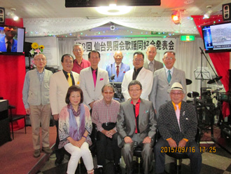 今年(平成27年)は8月24日愛宕神社の夏祭りに6名参加男厨祭りに5名参加、9月16日(水)には第3回歌の発表会を開催(年1回)、28年1月30日には宮城県歌謡選手権大会(亘理町中央公民館大ホール)が開催されますが8名がエントリーしています。もちろん柴田会長はゲスト出演されます。その他各カラケケ大会に出場しているメンバーもいます。このように機会あるごとに参加して唄うことが自信をつけています。