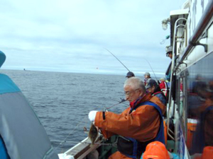 男厨会釣り同好会平成19年秋季例会 「真タコに大興奮、釣りもグルメも大満足」 恒例の釣り同好会秋季例会を11月21、22日、に開催しました。秋季例会は毎年1泊2日で釣りと美味しい海鮮料理を楽しむ事にしてます。 今回は南三陸歌津湾の五目釣りに挑戦しましたが、連休での家族サービスや男厨会の行事が重なり参加者が、6名だけの参加となりやや寂しい例会となりましたが、民宿の料理といい、釣りも大満足の2日間でした。宿泊は歌津町泊浜の高倉荘。入浴後期待の食事。席に着くと豪華盛沢山のお膳にビックリ。名物の「どんこ汁」「カジキマグロのカマ」の煮もの、一日掛かって煮込んだというものだけに大変美味なものでした。その他地元で採れた魚類の刺身等、食べきれない程のご馳走にお腹一杯で、大満足の夜でした。 2日目は期待の歌津湾の五目釣りです。が、ここで大ハプニング。実は22日は南三陸一帯で、「アワビの開口(アワビ漁の解禁日)」ということで、午前6時から9時まで釣り船が予定の6時には手配出来ないということになった。3時間で数十万円稼ぐアワビ漁では、漁師さんは釣り船のアルバイトなんか目でないのです。しかし、歌津に来た以上、どうしても釣りをしたいので、アワビ漁から帰ってきた、1隻を何とか手配してもらい、午前9時半に出港。天気も良く、海の凪の状態絶好の釣り日和となり、15分位走った所で、早速釣り開始。 |