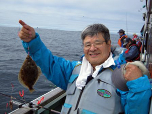また、T会員に「ゴツン」と当たりが。今度は慎重に上げたたら、先と同じ位の真ダコだった。ニコニコのT会員にまた当たりが、しかし、途中で軽くなり残念ながら3はい目の真ダコは夢と消えた。しかし、また、竿がしなり、30cmと40cmのアイナメがダブルで、釣れてまさにTデーの様子。しかし真ダコで大騒ぎしている間にK会員にまた、40cmクラスのナメタガレイ、そして最後の〆は、S会員の50cmクラスの見事なマコガレイを釣り上げたところで、予定を1時間繰り上げて釣りを終了。帰港して収穫したものを一杯にそれぞれ帰路に付、秋季例会は大満足のうちに無事終了しました。さて、釣り同好会の秋季例会「釣りと海鮮グルメの旅」も5年目となり、今回で一区切りということで、終了したいと思ってます。 |