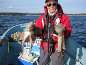 狙いはマコガレイや脂が乗ったアイナメですが、既に釣れる時間帯が過ぎていたので期待外れかなと思っていたら、直ぐ、強引に釣りに誘ったG会員に30cm位のマコガレイが掛かった。皆さん真剣に竿を出している時に近くにいた、別の釣り船から、歓声が上がり大騒ぎしていた。船頭さんが携帯で聞くと真ダコが続けて3ハイ掛かったようで、我々にもチャンスと思っていたら、I会員に拳2つ位の真ダコが上がり皆さん目の色がカレイからタコに変わってしまい、でも中々当たりの兆候がなく、その間、S会員、K会員が40cmクラスのナメタカレイを筆頭に、マコガレイ、アイナメだけでしたが、残り1時間たったとこで、マコガレイ1枚だけ釣って、不満顔の会員が根掛かりか(?)でも上がって来るので船頭さんが引っ張ると海中に白いものが見えた。船頭さんが「タコだ」と言って慎重に船上に引き上げると拳大の石を2個も抱えた真ダコでした。それも市場で買えば5千円もなるだろうという見事な真ダコでした。皆さん大騒ぎ。そしたらまたTさんにタコらしい兆候。静かに上げて来たが、急に軽くなり「逃げた」。 |