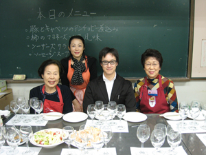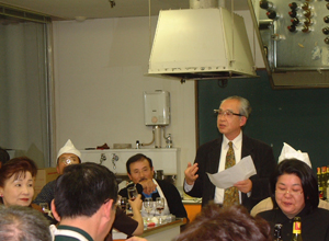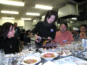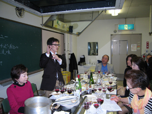 2時から料理班が活動開始。4時には準備完了後は、川村武明ソムリエを待つのみ。しかし5時なっても仕事が立て込んでいて間にあわず我慢しきれない参加者の熱望で、千葉忠平事務局長がワイン説明をし、真尾征雄による乾杯の音頭で開始。